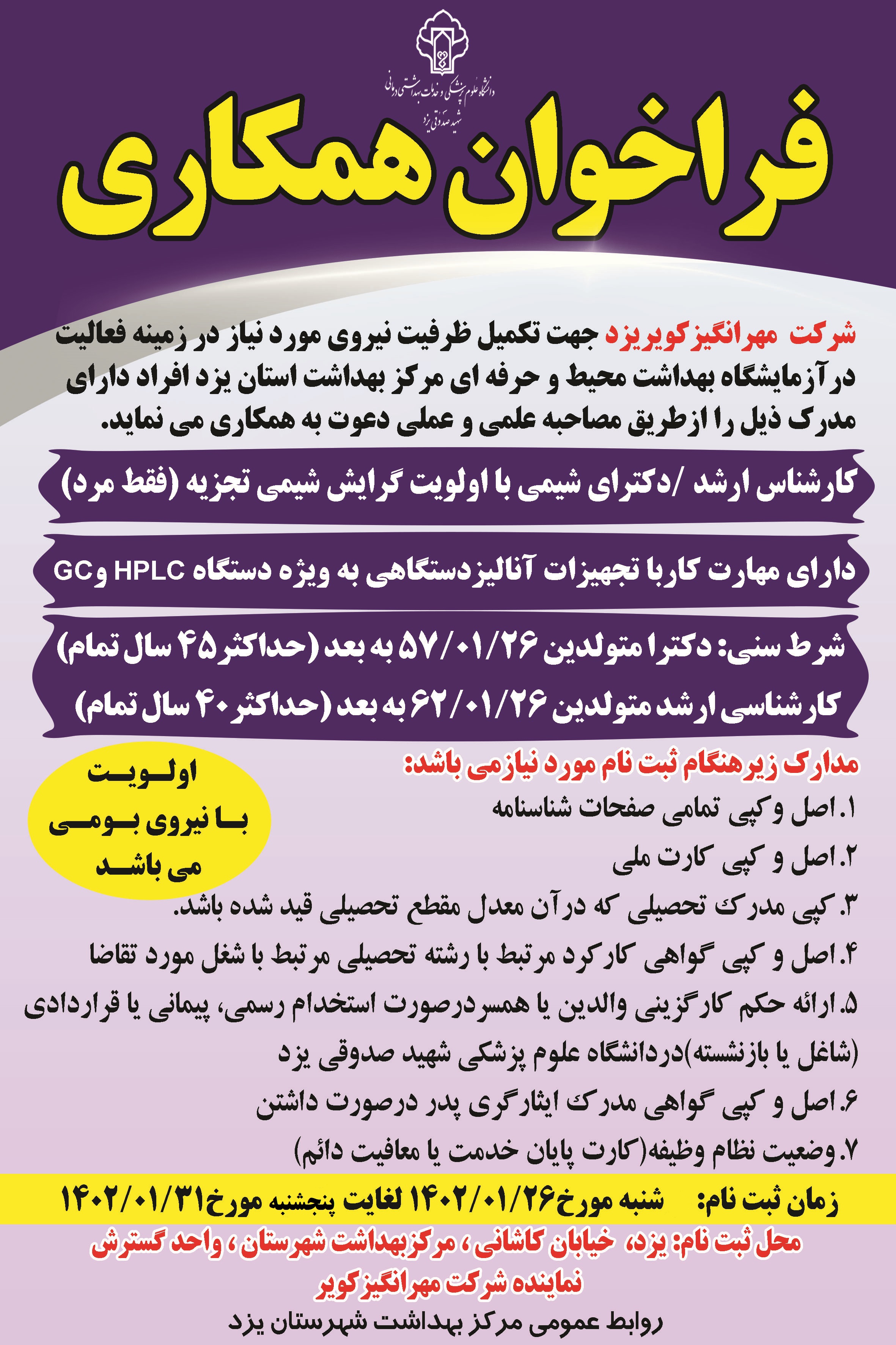 شرکت مهر انگیز کویر یزد در نظر دارد جهت تکمیل ظرفیت نیروی مورد نیاز در زمینه فعالیت در آزمایشگاه بهداشت محیط و حرفهای مرکز بهداشت استان یزد به صورت قراردادی از طریق مصاحبه علمی و عملی به کارگیری نماید.